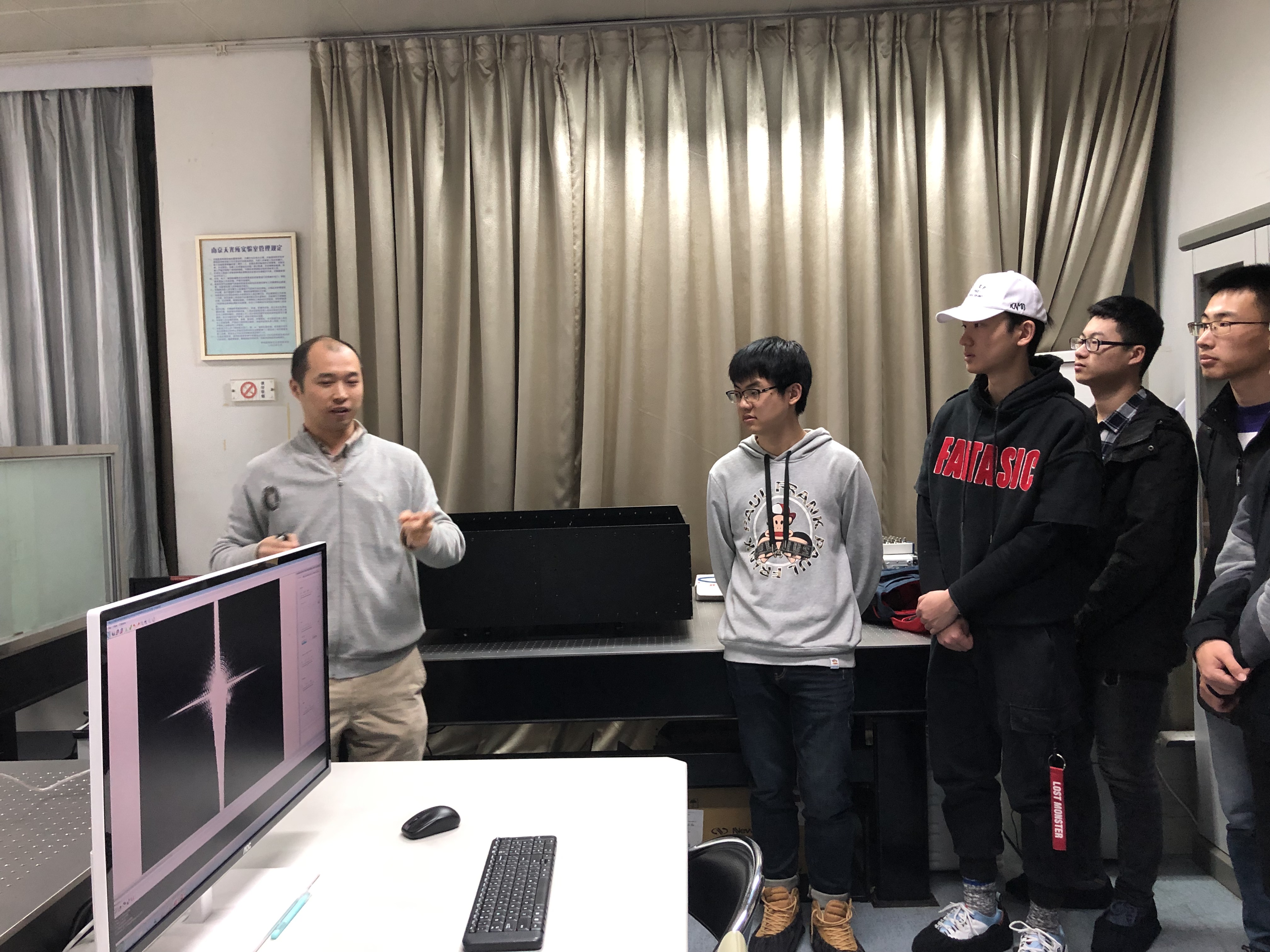 随后大家参观了系外行星探测技术实验室,这里主要开展天文仪器新技术和新概念天文仪器的研究。研究员详细地向我们介绍了在寻找类地行星方面开展的工作与相关进展,并激励大家投身人类这项伟大的事业。