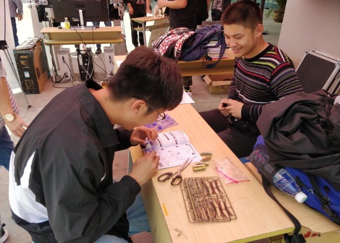 同时,有许多同学参与到了蜘蛛机器人的拼装中。机器人零件较多,拼装难度较大,但仍有一些同学完成了组装,领走了机器人。