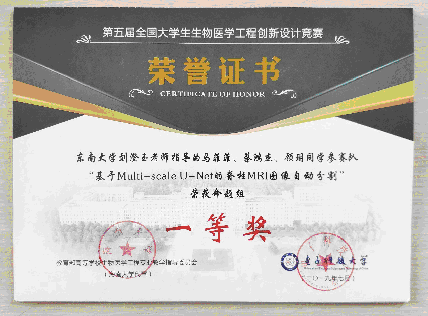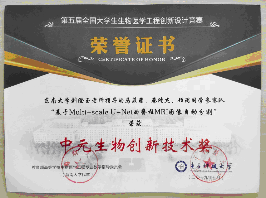 在刘澄玉老师的指导下,公司三位同学完成的人工智能类命题项目“基于Multi-scale U-Net的脊柱MRI图像自动分割”从众多队伍中脱颖而出,入围决赛。在决赛中,同学们从设计思路、模型建立过程、创新点、应用价值等对作品进行了多方位展示(海报、PPT答辩、现场程序演示测评等),得到了评委老师的一致认可,在所有人工智能命题组决赛答辩中分割指标高居前列,最终以优异成绩获得全国一等奖,并荣获中元生物创新技术奖。