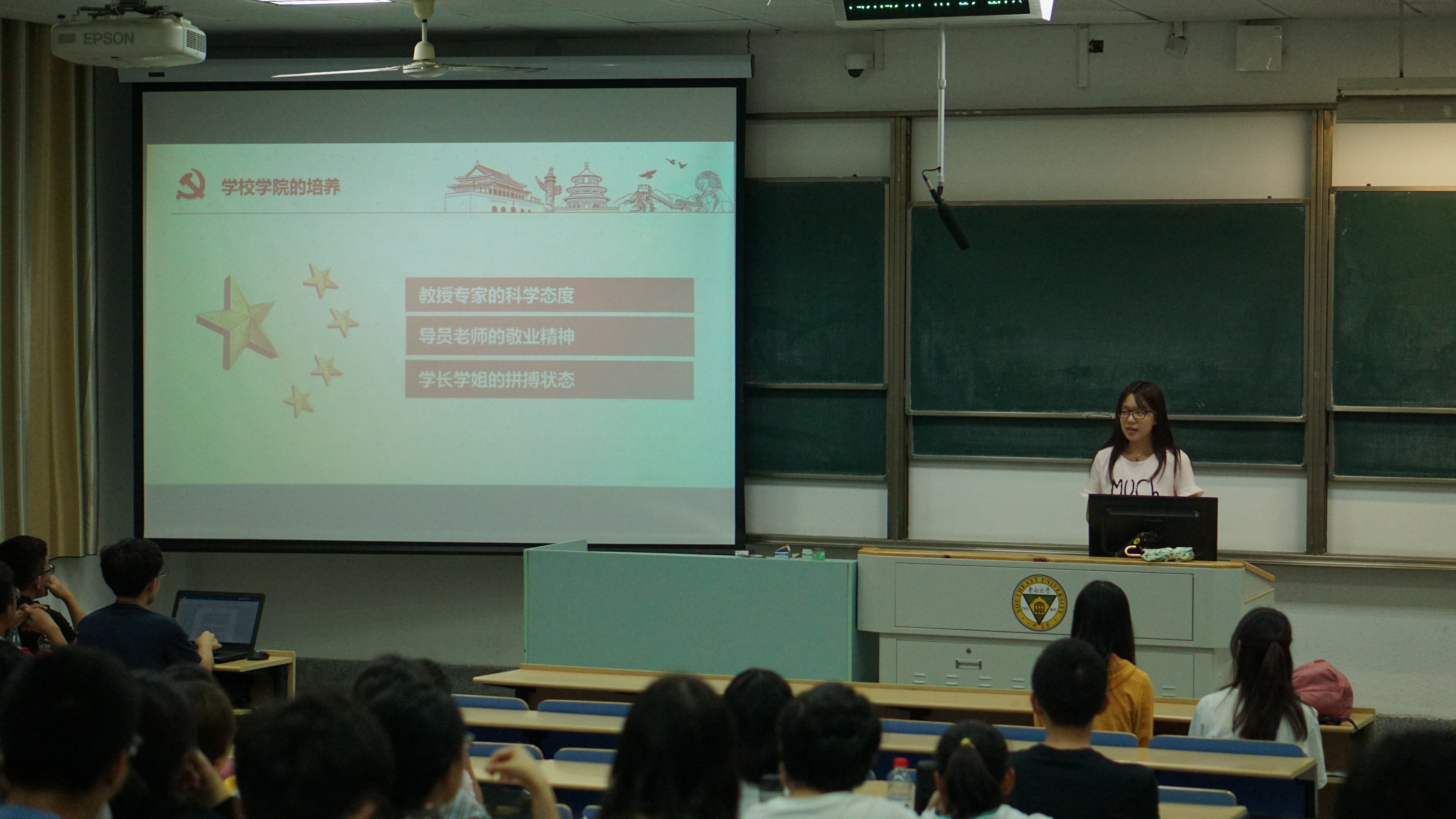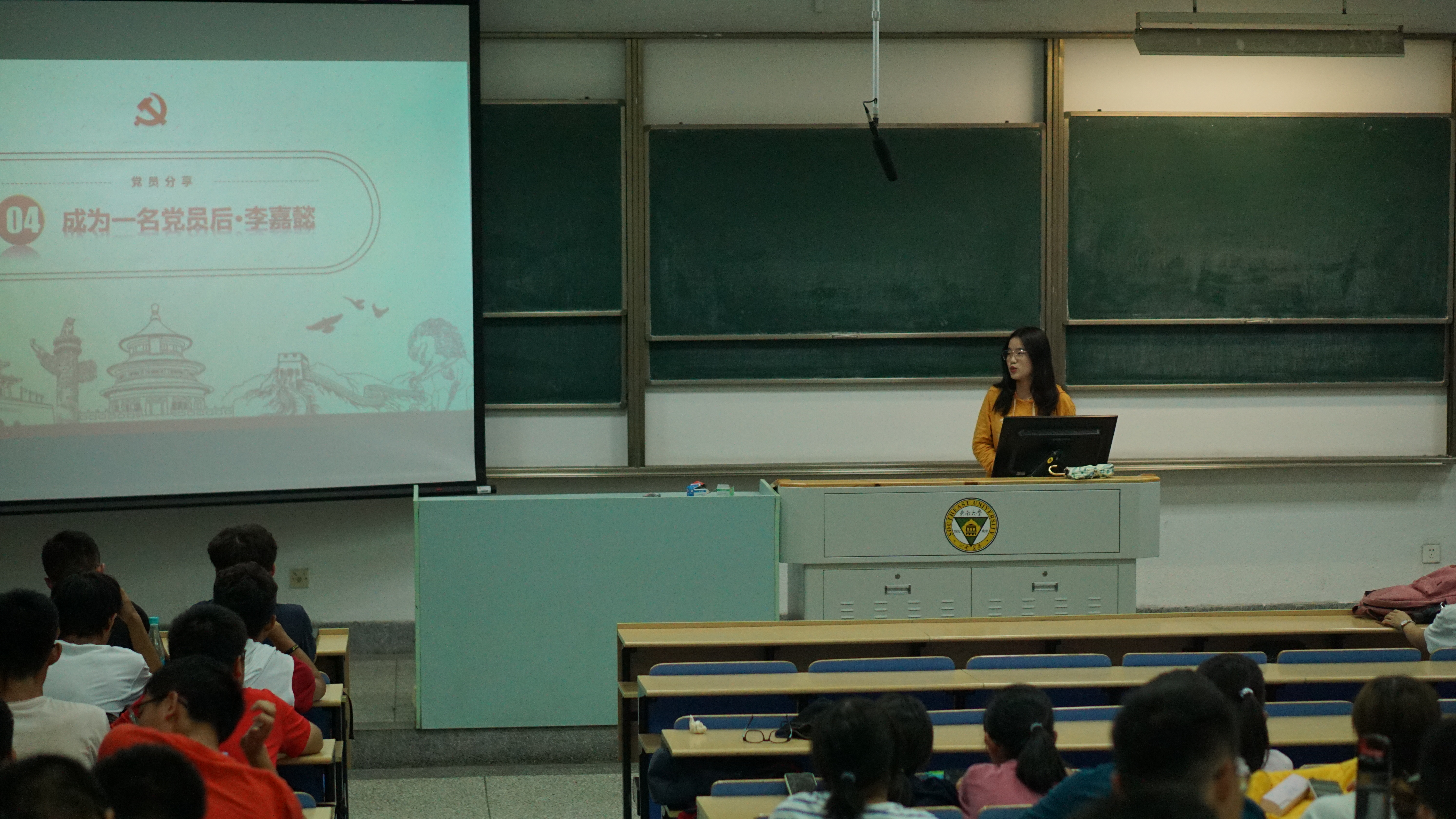 16级本科生党员李嘉懿向同学们介绍了本科生党员的老员工活。关心时事政治、学习政策方针、参与形式多样的党日活动等等,员工党员正是这样脚踏实地、积极进取,从而不断提高自身的思想理论水平,发挥先锋模范带头作用。