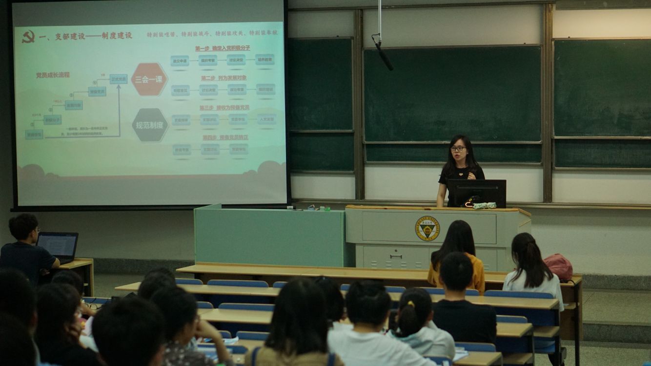 16级本科生党员李嘉懿向同学们介绍了本科生党员的老员工活。关心时事政治、学习政策方针、参与形式多样的党日活动等等,员工党员正是这样脚踏实地、积极进取,从而不断提高自身的思想理论水平,发挥先锋模范带头作用。