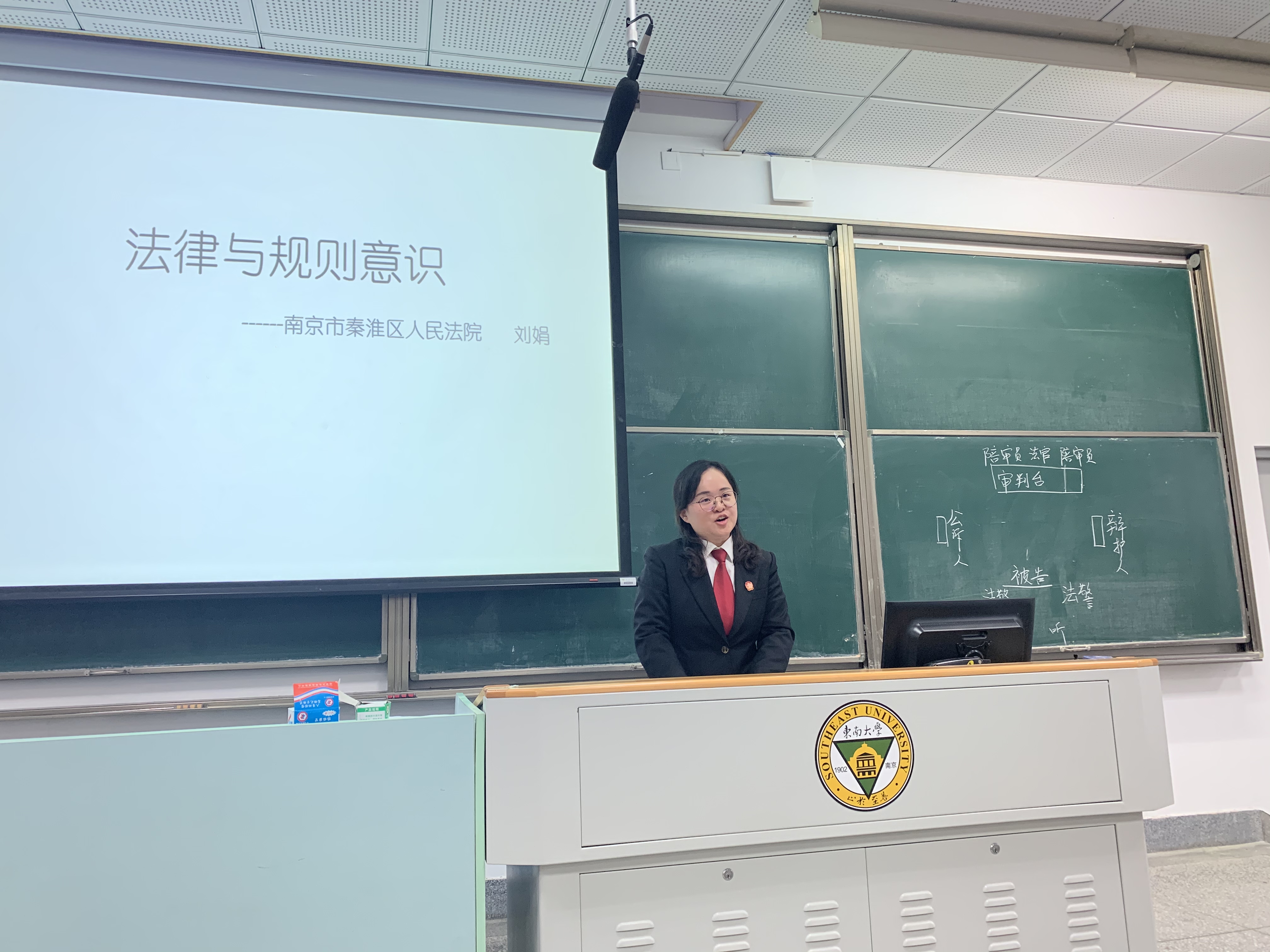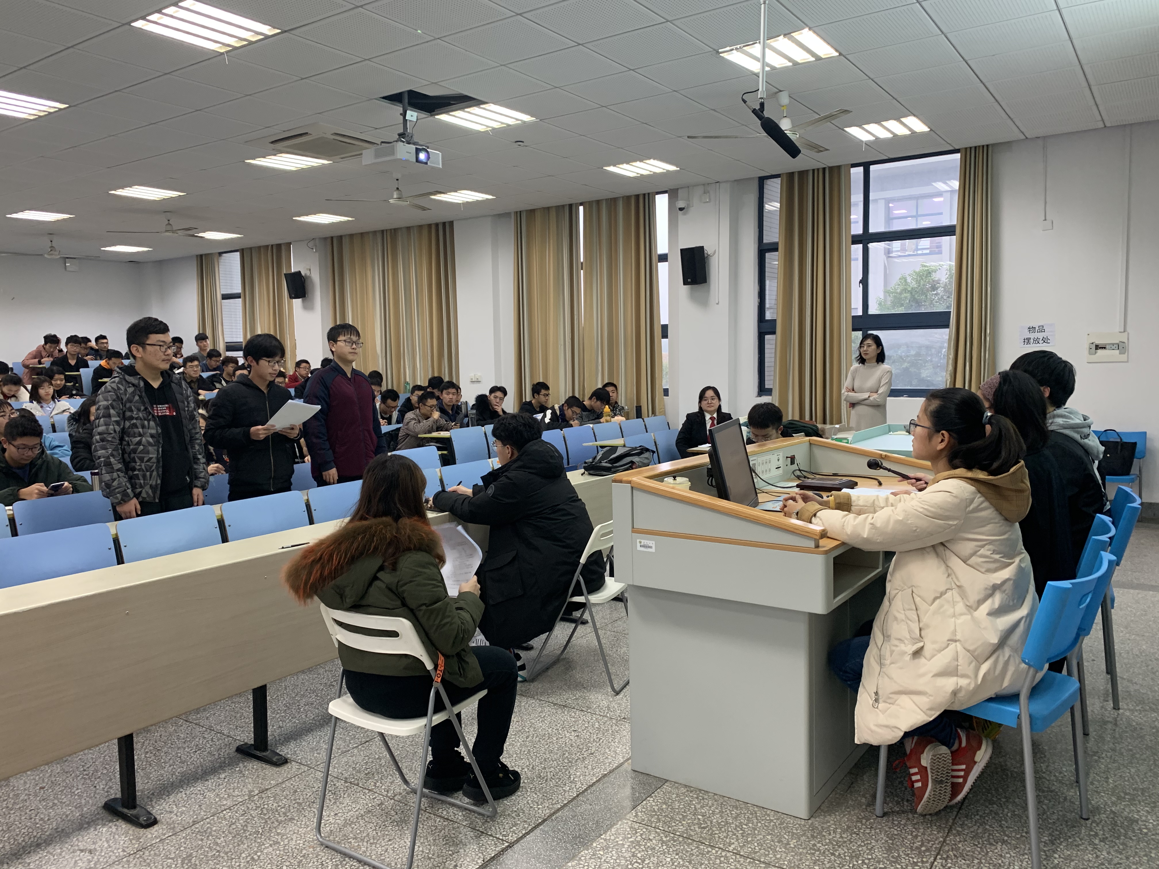 12月25日下午2:00,公司法律专题活动在教四204成功举办。本次活动包括模拟法庭及法律专题讲座两个部分,活动特邀嘉宾是来自南京市秦淮区人民法院刑事庭的刘娟法官。自动化电气测控大类新生200余人及思政课教师丁小丽、江莉莉、钱程老师参与了此次活动。
