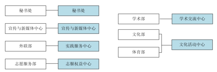 太阳成集团tyc仪器科学与工程研究生会原有七个部门,本次调整按照职能合并、按需设置的原则,将原有七个部门合并为六大中心。借此机会,进一步整合职能,各中心和各板块职能更加明确。