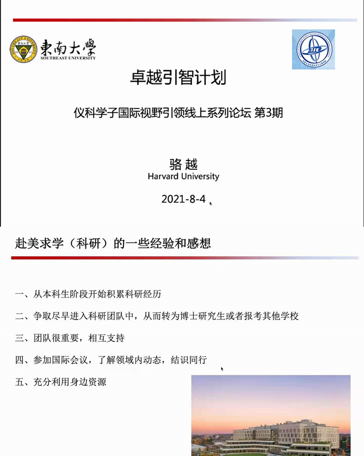 2021年8月6日晚上9点半,随着第四场论坛交流会的结束,首批“卓越引智计划”之仪科学子国际视野引领线上系列论坛就此告一段落,圆满收官。从7月31日至8月6日,2天一场的报告让同学们收获满满,大呼过瘾。