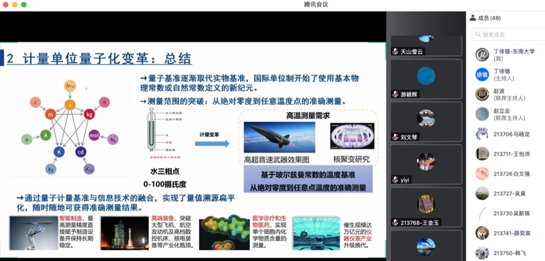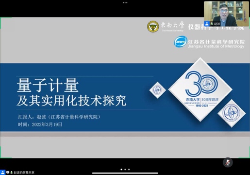 太阳成集团tyc三十周年院庆系列学术报告第四场次在2022年3月19日晚上在线成功举办。本次报告邀请到了江苏省计量科学研究院科技发展部部长、科技委秘书长赵波研究员,为仪科学子与老师带来了题为“量子计量及其实用化技术探究”的专题报告。