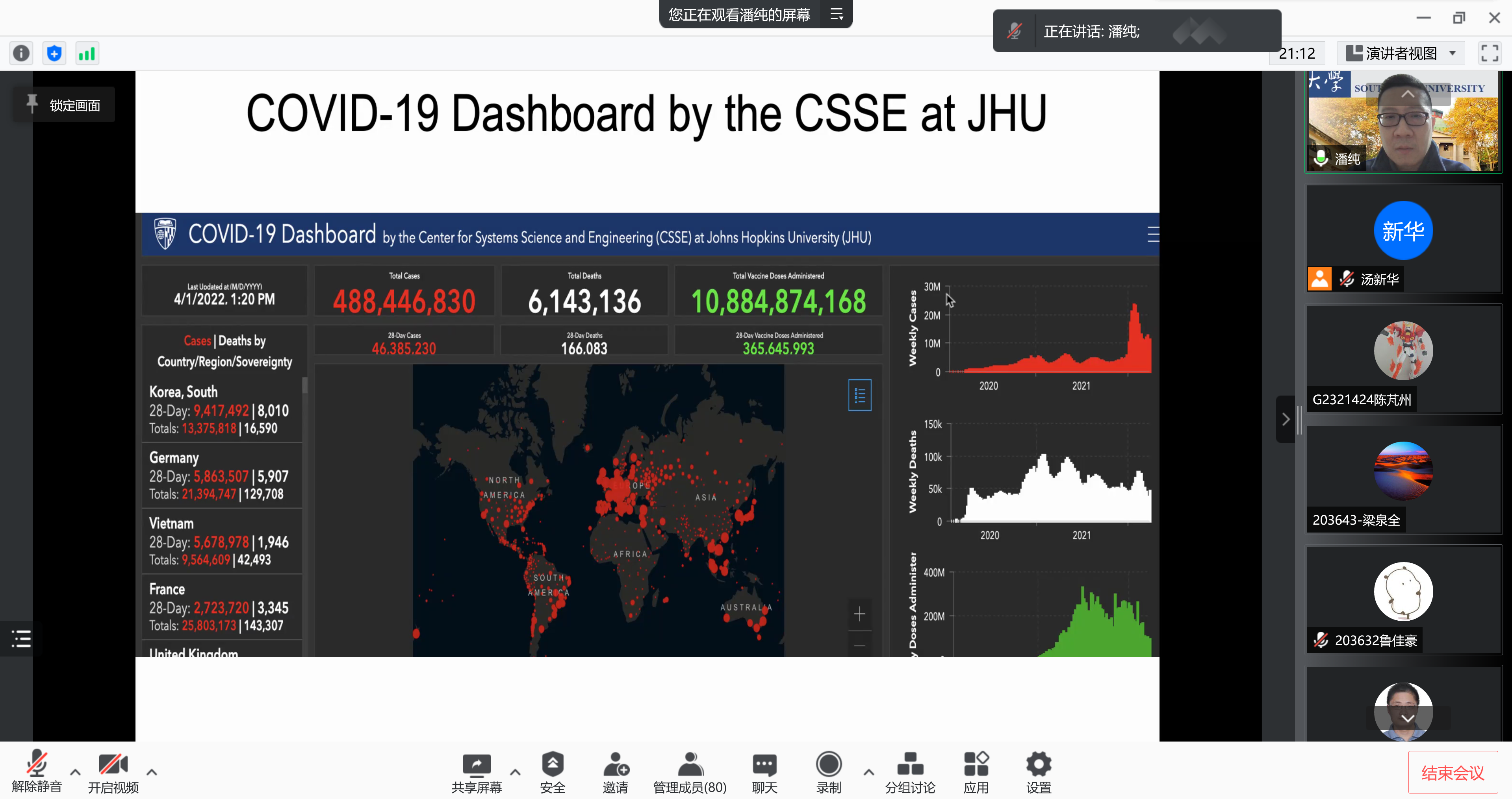 潘纯教授围绕目前新冠的疫情,通过国际、国内客观数据分析,从“疫情现状”、“防控政策”、“科学防控”等方面分享抗疫心得,为大家坚定抗疫信心、科学防控提供专业指导。