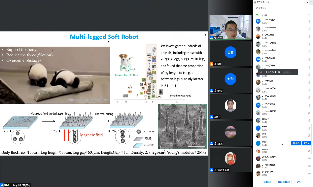 申亚京副教授围绕面向生物医学应用的微型机器人研发问题,深入浅出地介绍了“微型机器人的仿生设计方法”、“可控体内靶向送药”、“仿生智能感知”等几个方面的研究与心得,并与参会的老师和同学就微型仿生机器人发展面临的挑战、前沿技术以及仿生导航等交叉方向的问题进行了交流和探讨。