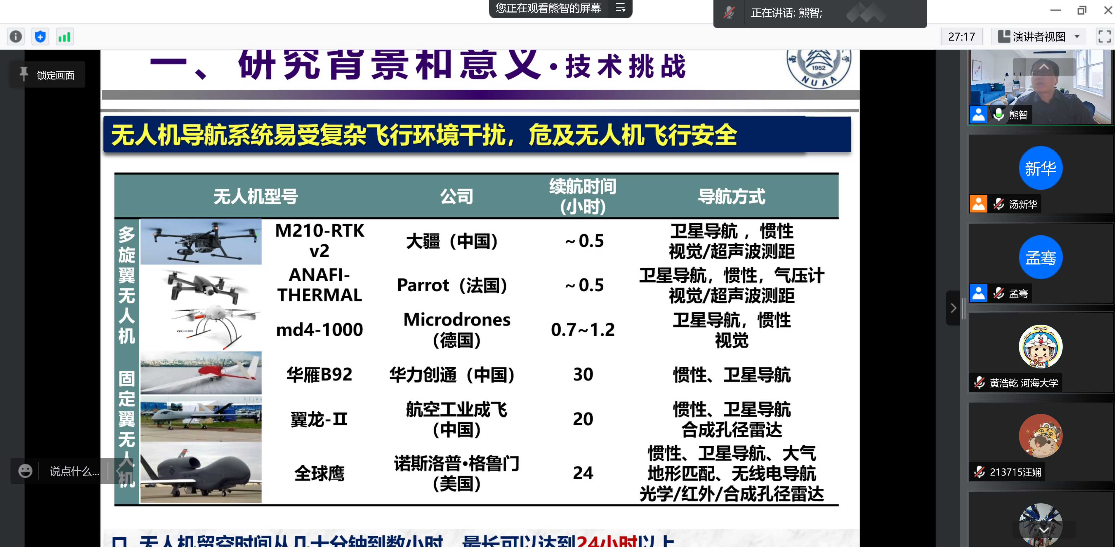 报告结合未来无人机及其集群技术的应用发展趋势,通过分析未来无人机集群系统对智能化导航技术的需求,介绍集群智能导航技术的发展途径,最后结合所在团队开展的研究工作,探讨未来集群智能导航系统实现及类脑导航等前沿关键技术,给听众带来了精彩的前沿智能导航技术研究心得分享。