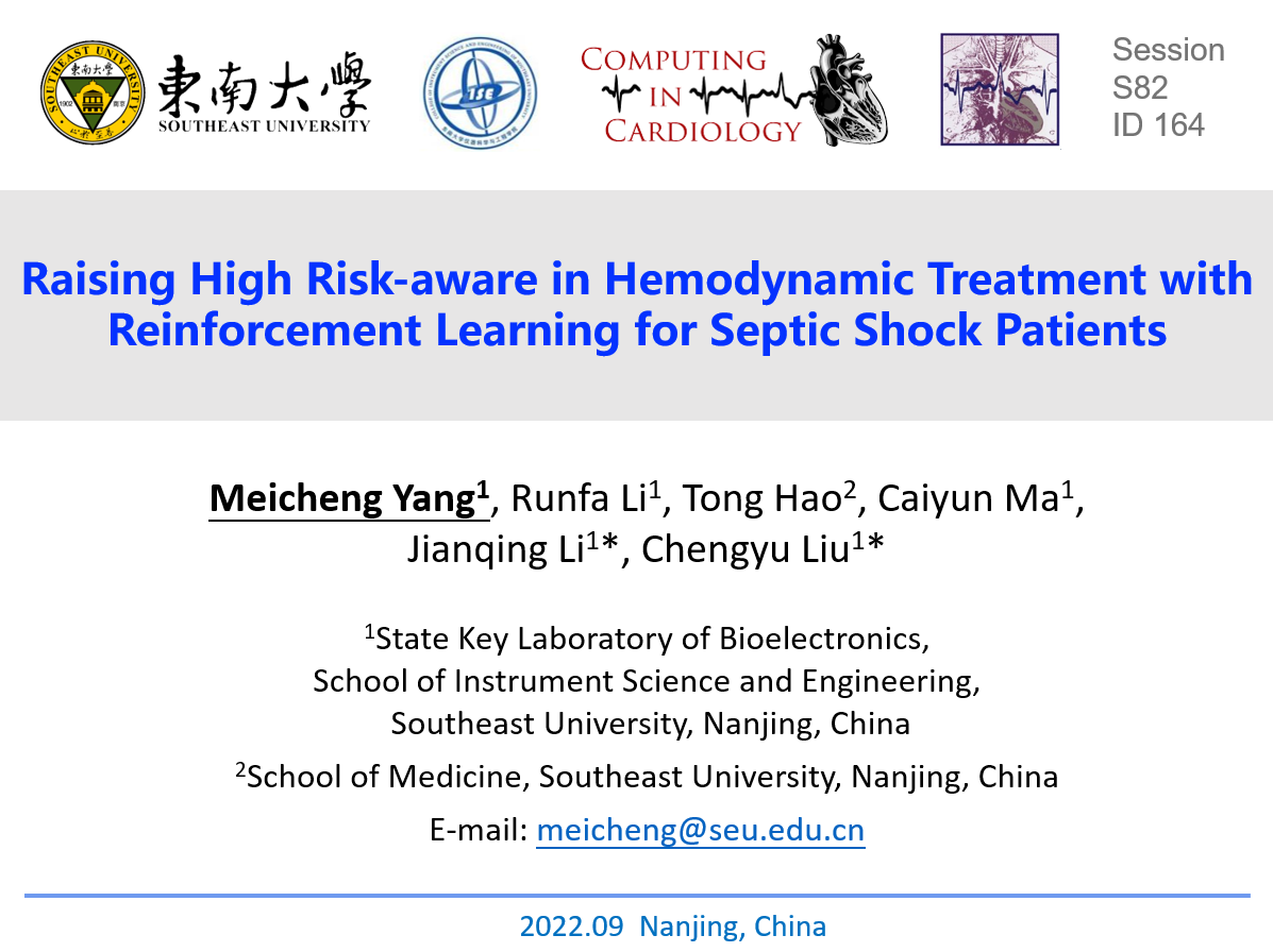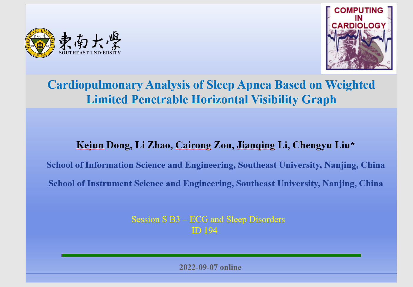 太阳成集团tyc刘澄玉教授和课题组博士生董珂君、李洋、杨美程、王星尧、马彩云以及课题组硕士生李茜、沈毓敏代表太阳成集团tyc穿戴式智能监控实验室参加了本次会议。在心电图和睡眠障碍(ECG and Sleep Disorders)分会场,董珂君做了题为《Cardiopulmonary Analysis of Sleep Apnea Based on Weighted Limited Penetrable Horizontal Visibility Graph》的口头报告,该报告分析了睡眠期间心肺动力系统的相互作用并为随后的睡眠阶段区分提供了可解释的基础。在光电容积描记术(Photoplethysmography )分会场,李洋做了题为《Effect of Oxygen Concentration Reduction on PPG Waveform Characteristics》的口头报告,该报告揭示了低氧环境对脉搏波波形特征的影响,填补了该领域的空白,探索了一种更舒适和无创的方法来观察和评估低氧条件下人体外周血管阻力和其他生理指标变化的路子,为高海拔缺氧环境中工作人员的生命健康监测提供了参考。在医学信息学与技术(Medical Informatics and Technology)分会场,杨美程做了题为《Raising High Risk-aware in Hemodynamic Treatment with Reinforcement Learning for Septic Shock Patients》的口头报告,该研究旨在利用强化学习方法识别脓毒性休克患者给药过程中的高风险治疗策略,做到早期监护和预警。其余员工分别在不同分会场进行了学术海报展示。