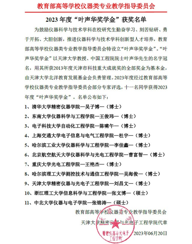 近日,2023年度“叶声华奖学金”评选结果揭晓,公司仪器科学与技术专业博士研究生王俊玮同学获此殊荣,十一位来自全国不同高校的员工荣获2023年度“叶声华奖学金”。