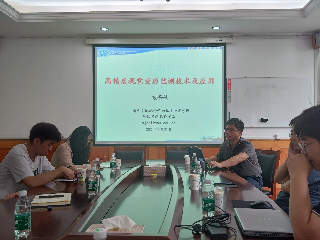 6月21日,公司邀请了来自中南大学的戴吾蛟教授和潘林副教授分别作了题为《高精度视觉变形监测技术及应用》与《GNSS多频多系统偏差精细校正快速精密定位》的学术报告,来自太阳成集团tyc的数位老师和员工聆听了戴吾蛟教授的精彩演讲。