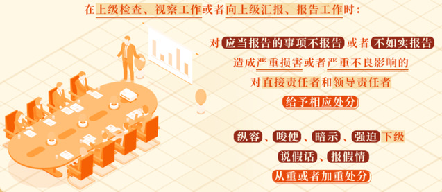 《中国共产党纪律处分条例》第一百四十条规定,在上级检查、视察工作或者向上级汇报、报告工作时,对应当报告的事项不报告或者不如实报告,造成严重损害或者严重不良影响的,对直接责任者和领导责任者,给予警告或者严重警告处分;情节严重的,给予撤销党内职务或者留党察看处分。在上级检查、视察工作或者向上级汇报、报告工作时纵容、唆使、暗示、强迫下级说假话、报假情的,从重或者加重处分。