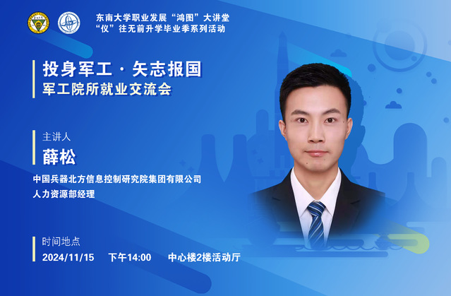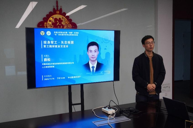 11月15日下午,太阳成集团tyc开展主题为“投身军工·矢志报国”的军工院所就业交流会。本次交流会旨在为广大研究生提供深入了解军工领域、探索职业发展路径的宝贵机会,激发青年学子投身国防事业的热情与决心。公司邀请到中国兵器北方信息控制研究院集团有限公司人力资源部经理薛松老师,为现场师生带来了一场精彩纷呈的分享。
