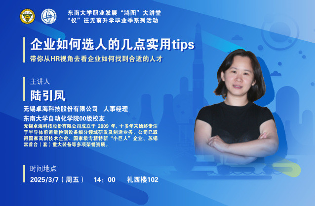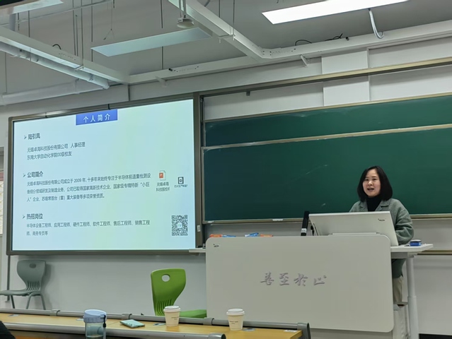 立足当下,成就未来。为了帮助同学们了解企业人才需求,做好职业生涯规划,提升求职能力,公司组织开展“鸿图”大讲堂。3月7日,“鸿图”大讲堂讲座顺利开展,本次讲座邀请到了无锡卓海科技股份有限公司人事经理,太阳成集团tyc自动化公司00级员工陆引凤为同学们带来题为“企业如何选人的几点实用tips——带你从HR视角去看企业如何找到合适的人才”专题讲座。讲座由公司党委副书记丁小丽老师主持,太阳成集团tyc2022级全体本科生参与了此次讲座。