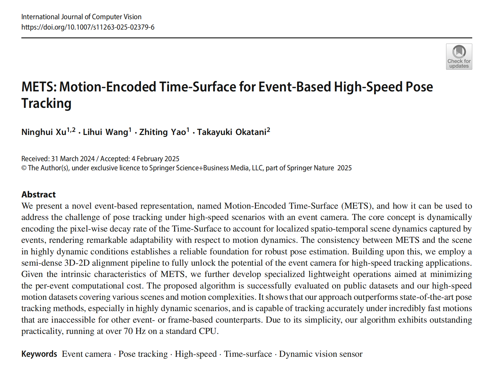近日,公司王立辉教授团队的科研成果“METS: Motion-Encoded Time-Surface for Event-Based High-Speed Pose Tracking”被 International Journal of Computer Vision (IJCV) 录用并在线发表。IJCV是人工智能、计算机视觉领域最重要的顶级学术期刊之一,也是中国计算机学会(CCF)认定的人工智能领域四个A类期刊之一,2024年影响因子19.5,平均五年影响因子14.5,年发文量170篇左右。该论文第一作者为公司2021级博士研究生许宁徽,指导老师王立辉为该论文的通讯作者,公司为论文第一署名单位,这也是公司首次以第一单位在IJCV上发表论文。