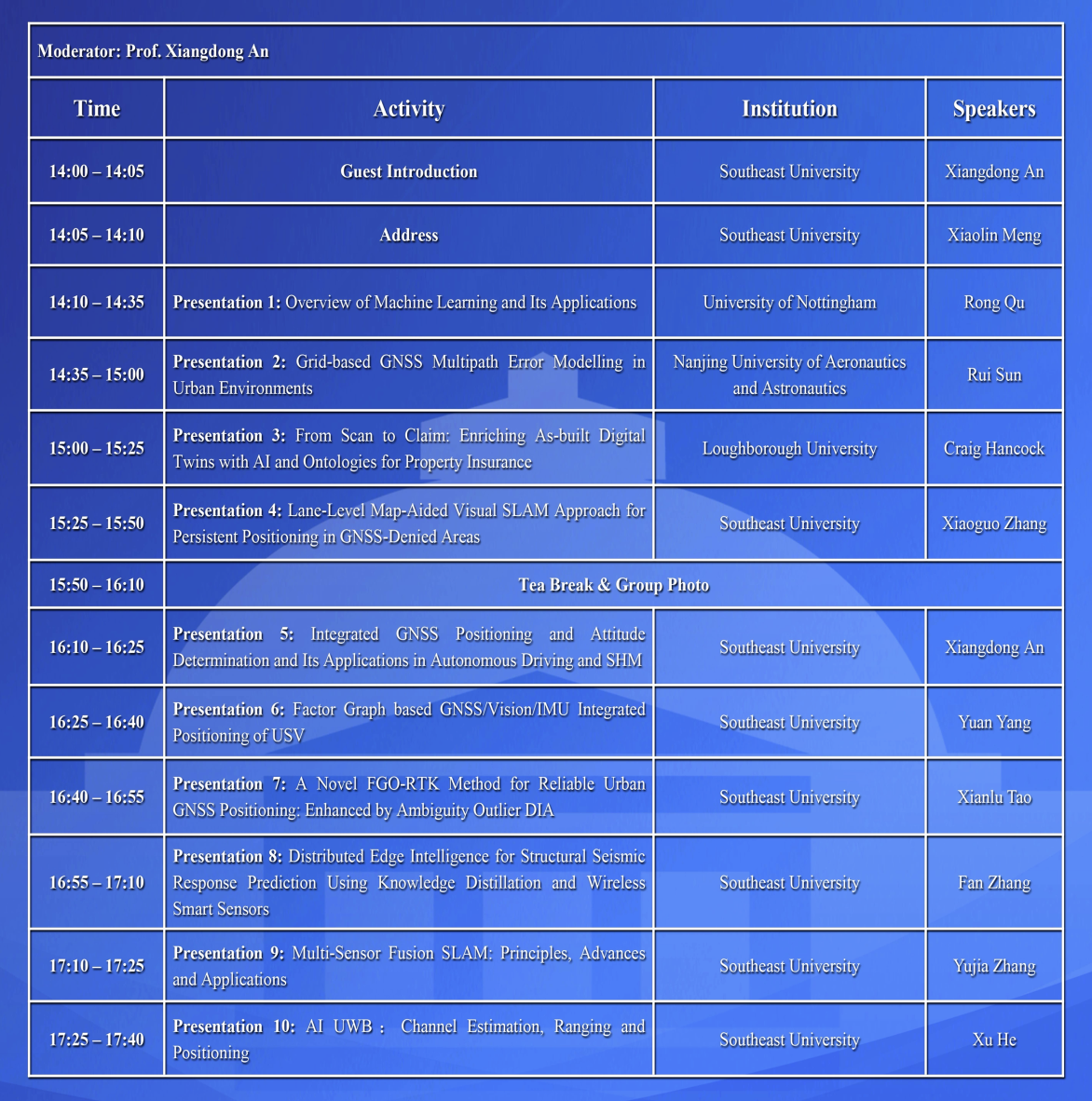 太阳成集团tyc张小国教授、安向东教授、阳媛副教授、陶贤露博士、张凡博士、张羽佳博士、博士研究生何旭分别作了题为“Lane-Level Map-Aided Visual SLAM Approach for Persistent Positioning in GNSS-Denied Areas”、“Integrated GNSS Positioning and Attitude Determination and Its Applications in Autonomous Driving and SHM”、“Factor Graph based GNSS/Vision/IMU Integrated Positioning of USV”、“A Novel FGO-RTK Method for Reliable Urban GNSS Positioning: Enhanced by Ambiguity Outlier DIA”、“Distributed Edge Intelligence for Structural Seismic Response Prediction Using Knowledge Distillation and Wireless Smart Sensors”、“Multi-Sensor Fusion SLAM: Principles, Advances and Applications”和“Al UWB: Channel Estimation, Ranging and Positioning”的学术报告。