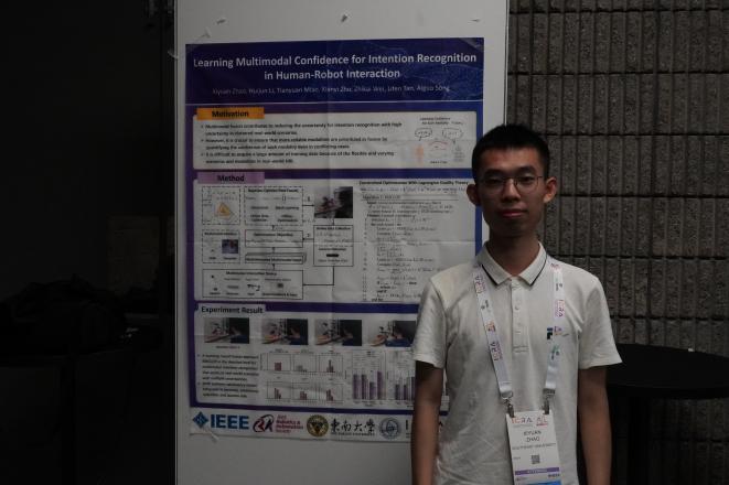 在分会场的报告环节,谢雨臻作了题为 “Multi-view Registration of Partially Overlapping Point Clouds for Robotic Manipulation” 的报告,该技术提出了'鲁棒配准-自适应提取-位姿图优化'创新框架,实现了30%低重叠率点云的多视角配准。赵熙远做了题为“Learning Multi-modal Confidence for Intention Recognition in Human-Robot Interaction”的报告,为提升人机交互多模意图融合表现提供了最新理论与系统实现。该工作基于贝叶斯融合理论引入了量化模态置信,通过在置信约束下优化学习,创新地提出了一种人机多模交互与置信学习框架,在人机交互助老康复等领域具有广阔的应用前景。两位同学与国际领域专家共同分享了公司机器人所近年来在遥操作机器人、人机交互机器人等方面的最新进展。